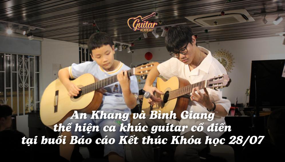 Vào ngày 28/07 vừa qua, buổi Báo cáo Kết thúc Khóa học của Guitar Academy đã chứng kiến những màn trình diễn đầy cảm xúc và hoài niệm từ hai học viên guitar tài năng, An Khang và Bình Giang. Cả hai đều là học trò của thầy Bùi Duy Trường, một giáo viên chuyên về guitar cổ điển, người đã tận tình hướng dẫn các em trong suốt mùa hè, giúp kỹ năng chơi đàn của các em tiến bộ vượt bậc.