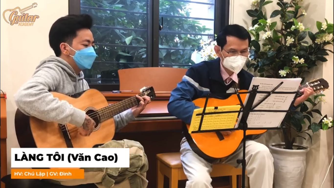Bản hòa tấu sâu lắng của thầy giáo Đình Đoàn và chú Lập – một trong những học viên lớn tuổi nhất tại trung tâm Guitar Academy đã mang đến một màu sắc trầm lắng như cái hồn của “Làng tôi”.